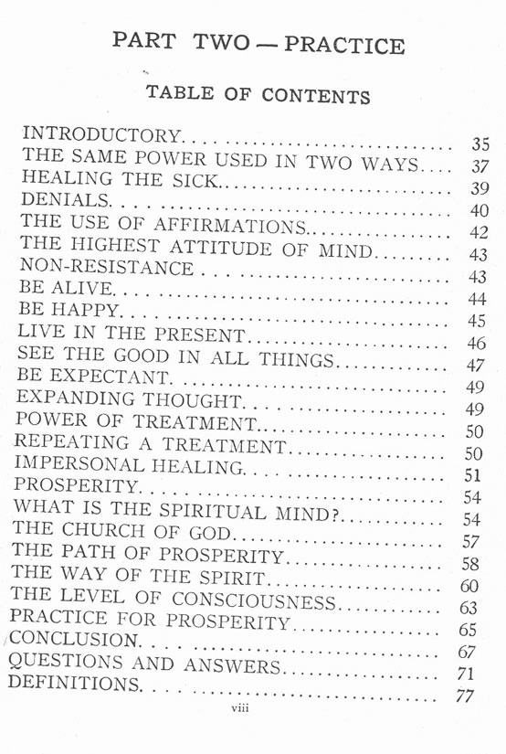 Contents - In the Beginning - A Princi[ple That Can Be Proven - The Word Going Forth - Why and What is Man? - The Law of Our Lives - Man's Part - Bondage and Freedom - The Word - The Man Who Has Arrived - The Power Within - Individual Ideas - The Reason for the Universe - Mind In Action - Action and Reaction - Arriving at a High Consciousness - Outer Suggestions - Use of the Greater Consciousness - The Greater Consciousness - Perfect Universe - About Struggle Karma - Practice -