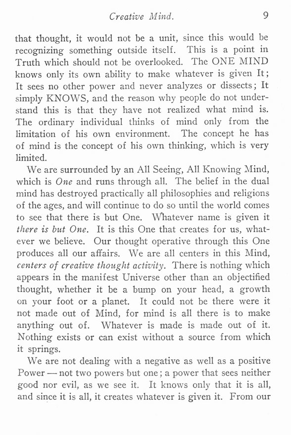 We are surrounded by an All Seeing, All Knowing Mind, which is One and runs through all. The belief in the dual mind has destroyed practically all philosophies and religions of the ages, and will continue to do so until the world comes to see that there is but One. Whatever name is given it there is but One. It is this One that creates for us, whatever we believe. Our thought operative through this One produces all our affairs. We are all centers in this Mind, centers of creative thought activity. There is nothing which appears in the manifest Universe other than an objectified thought, whether it be a bump on your head, a growth on your foot or a planet. It could not be there were it not made out of Mind, for mind is all there is to make anything out of. Whatever is made is made out of it. Nothing exists or can exist without a source from which it springs.