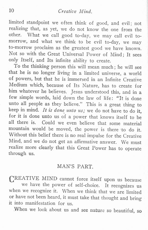 To the thinking person this will mean much; he will see that he is no longer living in a limited universe, a world of powers, but that he is immersed in an Infinite Creative Medium which, because of Its Nature, has to create for him whatever he believes. Jesus understood this, and in a few simple words, laid down the law of life: "It is done unto all people as they believe." This is a great thing to keep in mind. It is done unto us; we do not have to do it, for it is done unto us of a power that knows itself to be all there is. Could we even believe that some material mountain would be moved, the power is there to do it. Without this belief there is no real impulse for the Creative Mind, and we do not get an affirmative answer. We must realize more clearly that this Great Power has to operate through us.