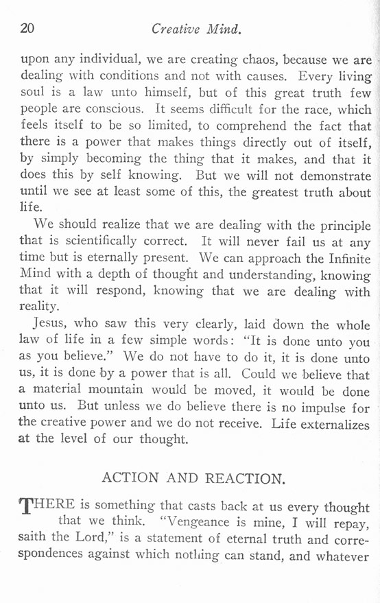 upon any individual, we are creating chaos, because we are dealing with conditions and not with causes. Every living soul is a law unto himself, but of this great truth few people are conscious. It seems difficult for the race, which feels itself to be so limited, to comprehend the fact that there is a power that makes things directly out of itself, by simply becoming the thing that it makes, and that it does this by self knowing. But we will not demonstrate until we see at least some of this, the greatest truth about life.