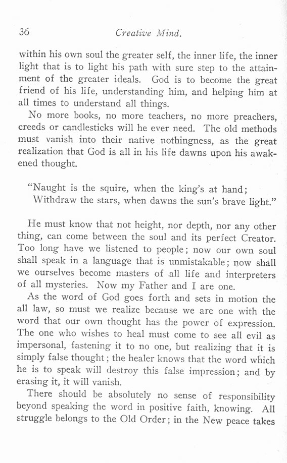 No more books, no more teachers, no more preachers, creeds or candlesticks will he ever need. The old methods must vanish into their native nothingness, as the great realization that God is all in his life dawns upon his awakened thought.
