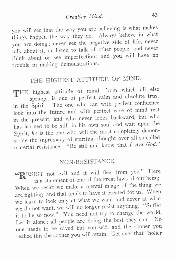 When we resist we make a mental image of the thing we are fighting, and that tends to have it created for us. When we learn to look only at what we want and never at what we do not want, we will no longer resist anything. "Suffer it to be so now." You need not try to change the world. Let it alone; all people are doing the best they can. No one needs to be saved but yourself, and the sooner you realize this the sooner you will attain. 'Get over that "holier