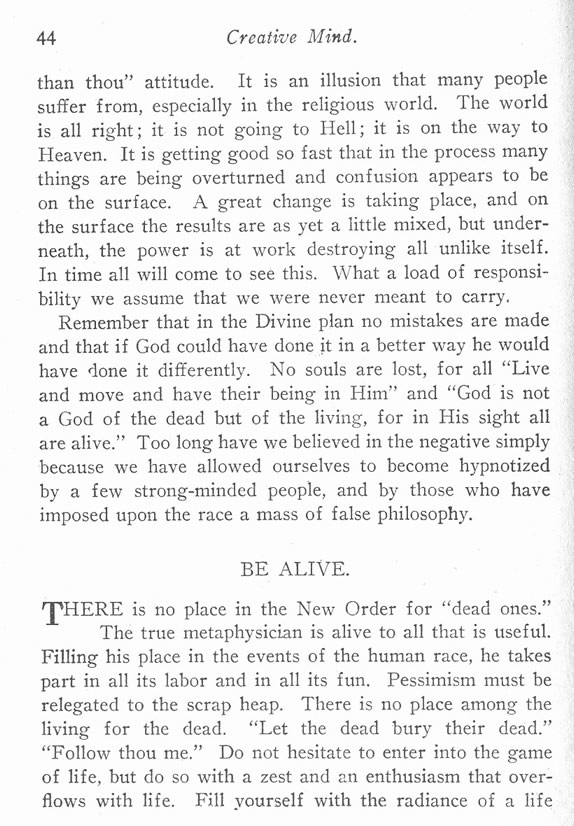 Remember that in the Divine plan no mistakes are made and that if God could have done it in a better way he would have done it differently. No souls are lost, for all "Live and move and have their being in Him" and "God is not a God of the dead but of the living, for in His sight all are alive." Too long have we believed in the negative simply because we have allowed ourselves to become hypnotized by a few strong-minded people, and by those who have imposed upon the race a mass of false philosophy.