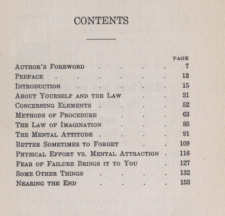 Author's Foreword - Preface - Introduction - About Yourself and the Law - Concerning Elements - Methods of Procedure - The Law of Imagination - The Mental Attitude - Better Sometimes to Forget - Physical Effort vs. Mental Attraction - Fear of Failure Brings It to You - Some Other Things - Nearing The End - Contents -