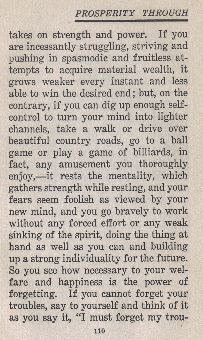 takes on strength and power. If you are incessantly struggling, striving and pushing in spasmodic and fruitless attempts to acquire material wealth, it grows weaker every instant and less able to win the desired end; but, on the contrary, if you can dig up enough self-control to turn your mind into lighter channels, take a walk or drive over beautiful country roads, go to a ball game or play a game of billiards, in fact, any amusement you thoroughly enjoy, --- it rests the mentality, which gathers strength while resting, and your fears seem foolish as viewed by your new mind, and you go bravely to work without any forced effort or any weak sinking of the spirit, doing the thing at hand as well as you can and building up a strong individuality for the future. So you see how necessary to your welfare and happiness is the power of forgetting. If you cannot forget your troubles, say to yourself and think of it as you say it, "I must forget my troubles."