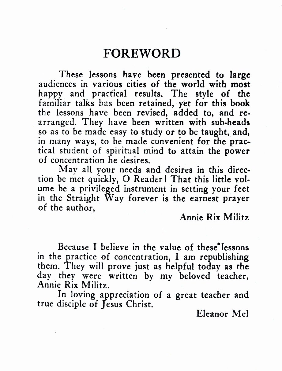 Because I believe in the value of these lessons in the practice of concentration, I am republishing them. They will prove just as helpful today as the day they were written by my beloved teacher, Annie Rix Militz.