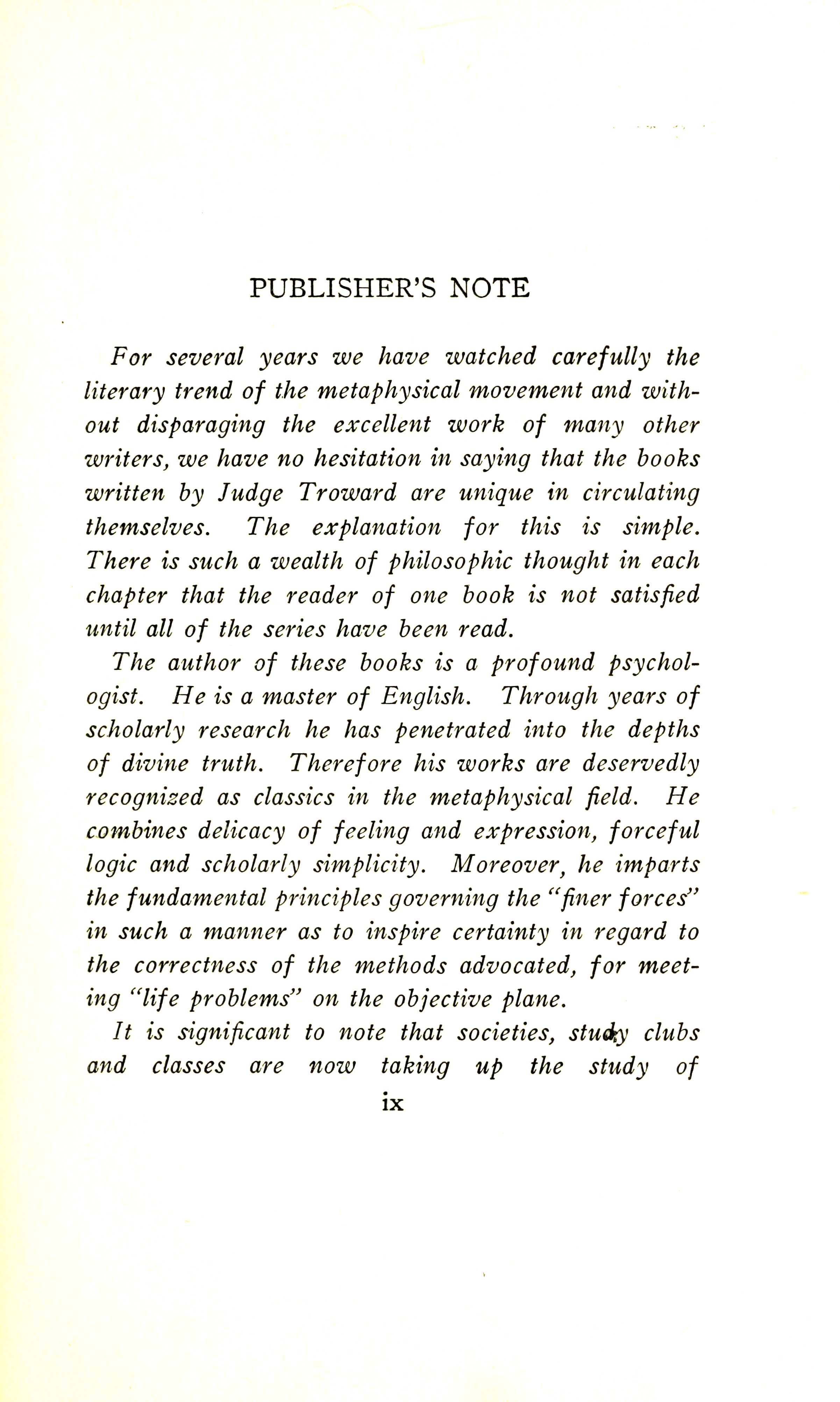 Inspired by Thomson Jay Hudson's The Law of Psychic Phenomena, Troward's Edinburgh Lectures on Mental Science was a bestseller. This prompted Troward to pen Bible Mystery and Meaning.