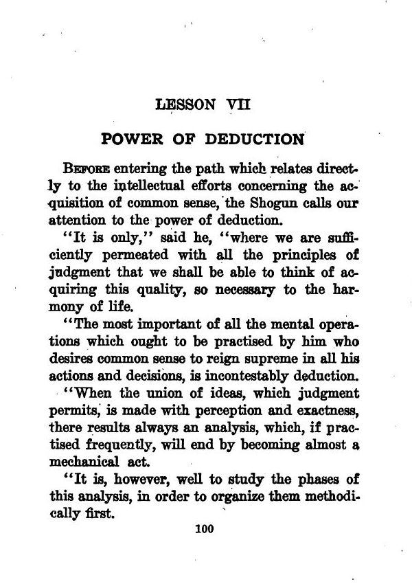 Before entering the path which relates directly to the intellectual efforts concerning the acquisition of common sense, the Shogun calls our attention to the power of deduction.