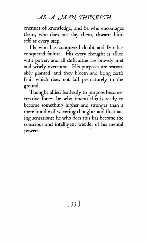 Thought allied fearlessly to purpose becomes creative force; he who knows this is ready to become something higher and stronger than a mere bundle of wavering thoughts and fluctuating sensations; he who does this has become the conscious and intelligent wielder of his mental powers.