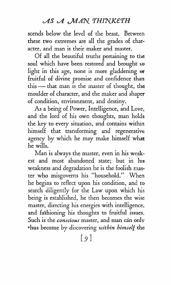Man is always the master, even in his weakest and most abandoned state; but in his weakness and degradation he is the foolish master who misgoverns his "household." When he begins to reflect upon his condition, and to search diligently for the Law upon which his being is established, he then becomes the wise master, directing his energies with intelligence, and fashioning his thoughts to fruitful issues. Such is theconscious master, and man can only thus become by discovering within himself the