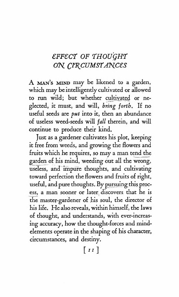 Just as a gardener cultivates his plot, keeping it free from weeds, and growing the flowers and fruits which he requires, so may a man tend the garden of his mind, weeding out all the wrong, useless, and impure thoughts, and cultivating toward perfection the flowers and fruits of right, useful, and pure thoughts. By pursuing this process, a man sooner or later discovers that he is the master-gardener of his soul, the director of his life. He also reveals, within himself, the laws of thought, and understands with ever-increasing accuracy, how the thought forces and mind elements operate in the shaping of his character, circumstances, and destiny.