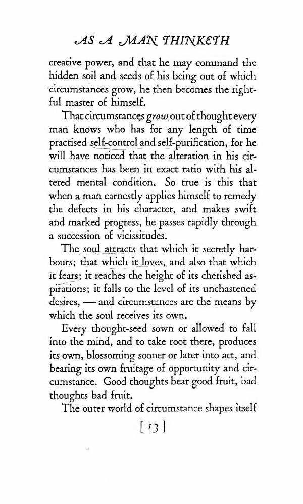 creative power, and that he may command the hidden soil and seeds of his being out of which circumstances grow, he then becomes the rightful master of himself.