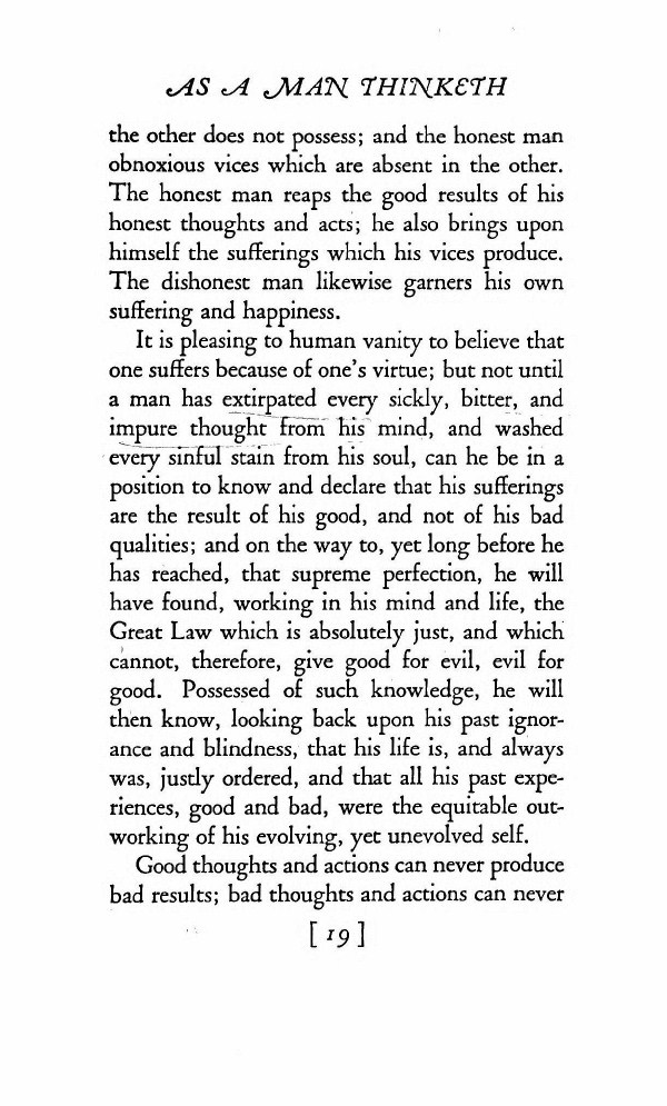 It is pleasing to human vanity to believe that one suffers because of one's virtue; but not until a man has extirpated every sickly, bitter, and impure thought from his mind, and washed every sinful stain from his soul, can he be in a position to know and declare that his sufferings are the result of his good, and not of his bad qualities; and on the way to that supreme perfection, he will have found working in his mind and life, the Great Law which is absolutely just, and which cannot give good for evil, evil for good. Possessed of such knowledge, he will then know, looking back upon his past ignorance and blindness, that his life is, and always was, justly ordered, and that all his past experiences, good and bad, were the equitable outworking of his evolving, yet unevolved self.