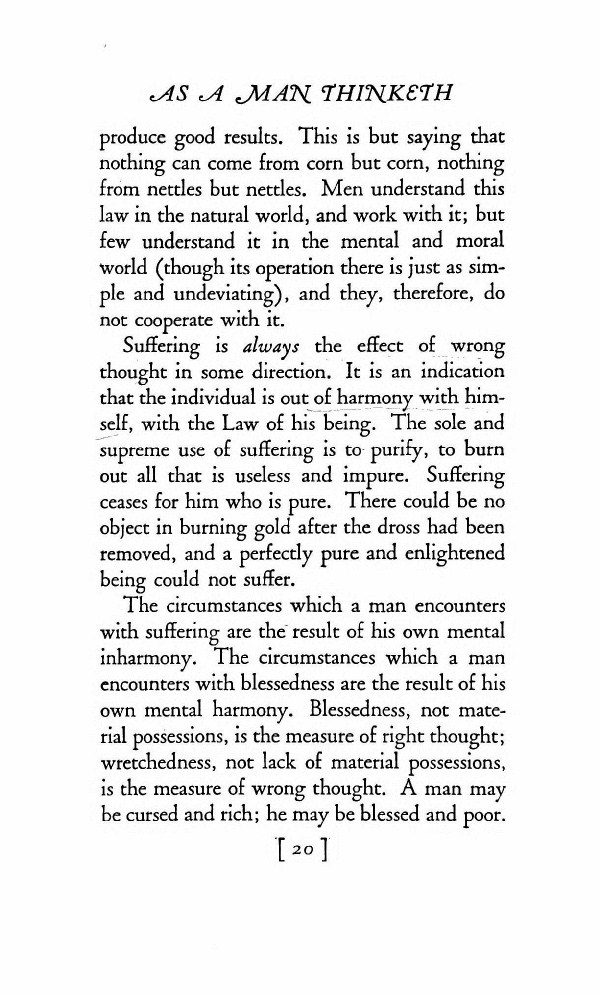 The circumstances which a man encounters with suffering are the result of his own mental inharmony. The circumstances which a man encounters with blessedness are the result of his own mental harmony. Blessedness, not material possessions, is the measure of right thought; wretchedness, not lack of material possessions, is the measure of wrong thought. A man may be cursed and rich; he may be blessed and poor.