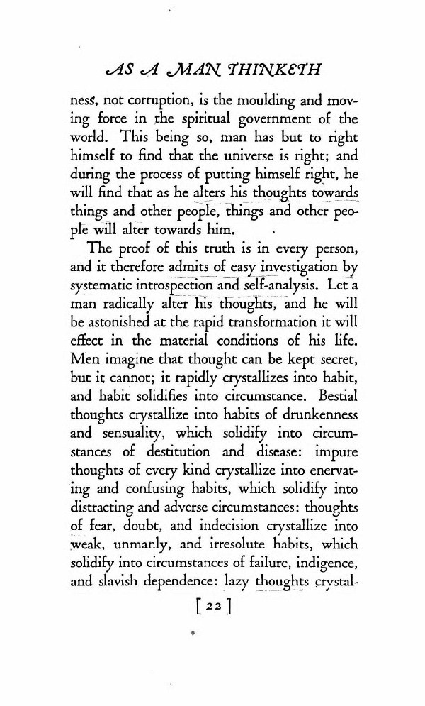 Men imagine that thought can be kept secret, but it cannot; it rapidly crystallizes into habit, and habit solidifies into circumstances. Bestial thoughts crystalize into habits of drunkenness and sensuality, which solidify into circumstances of destitution and disease; impure thoughts of every kind crystallize into enervating and confusing habits, which solidify into distracting and adverse circumstances; thoughts of fear, doubt, and indecision crystallize into weak, unmanly, and irresolute habits, which solidify into circumstances of failure, indigence, and slavish dependence; lazy thoughts crystallize