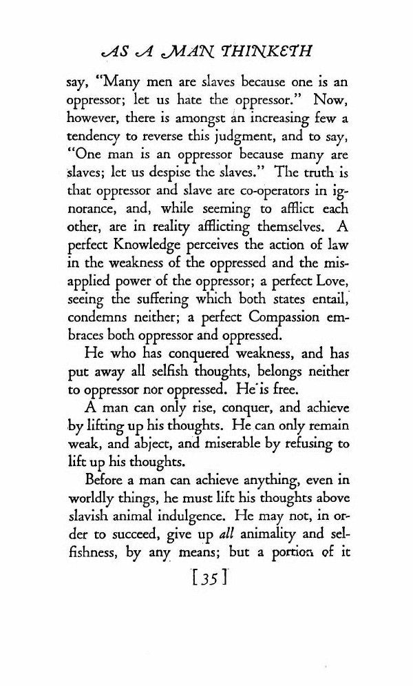 say, "Many men are slaves because one is an oppressor; let us hate the oppressor." Now, however, there is among an increasing few a tendency to reverse this judgment, and to say, "One man is an oppressor because many are slaves; let us despise the slaves." The truth is that oppressor and slave are co-operators in ignorance, and, while seeming to afflict each other, are in reality afflicting themselves. A perfect Knowledge perceives the action of law in the weakness of the oppressed and the misapplied power of the oppressor. A perfect Love, seeing the suffering which both states entail, condemns neither. A perfect Compassion embraces both oppressor and oppressed.