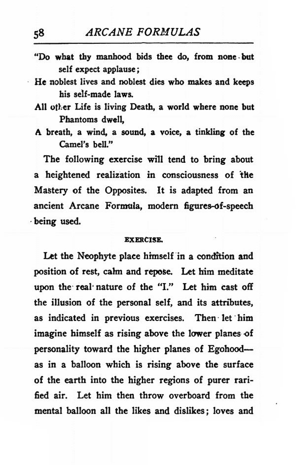 The following exercise will tend to bring about a heightened realization in consciousness of the Mastery of the Opposites. It is adapted from an ancient Arcane Formula, modern figures-of-speech being used.