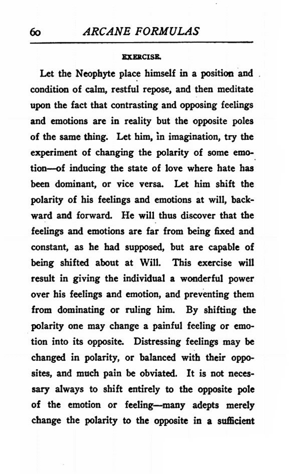Let the Neophyte place himself in a position and condition of calm, restful repose, and then meditate upon the fact that contrasting and opposing feelings and emotions are in reality but the opposite poles of the same thing. Let him, in imagination, try the experiment of changing the polarity of some emotion --- of inducing the state of love where hate has been dominant, or vice versa. Let him shift the polarity of his feelings and emotions at will, backward and forward. He will thus discover that the feelings and emotions are far from being fixed and constant, as he had supposed, but are capable of being shifted about at Will. This exercise will result in giving the individual a wonderful power over his feelings and emotion, and preventing them from dominating or ruling him. By shifting the polarity one may change a painful feeling or emotion into its opposite. Distressing feelings may be changed in polarity, or balanced with their opposites, and much pain be obviated. It is not necessary always to shift entirely to the opposite pole of the emotion or feeling --- many adepts merely change the polarity to the opposite in a sufficient