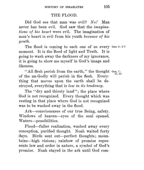 Flood --- fuller realization, washed away every conception, purified thought. Noah waited forty days. Birds sent out --- perfect thoughts; mountains --- high visions; rainbow of promise represents law and order in nature, a symbol of God's promise. Noah stayed in the ark until God commanded