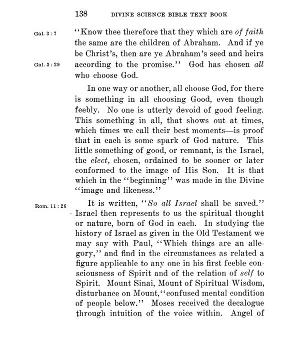 It is written, "So all Israel shall be saved." Israel then represents to us the spiritual thought or nature, born of God in each. In studying the history of Israel as given in the Old Testament we may say with Paul, "Which things are an allegory," and find in the circumstances as related a figure applicable to any one in his first feeble consciousness of Spirit and of the relation of self to Spirit. Mount Sinai, Mount of Spiritual Wisdom, disturbance on Mount," confused mental condition of people below." Moses received the decalogue through intuition of the voice within. Angel of