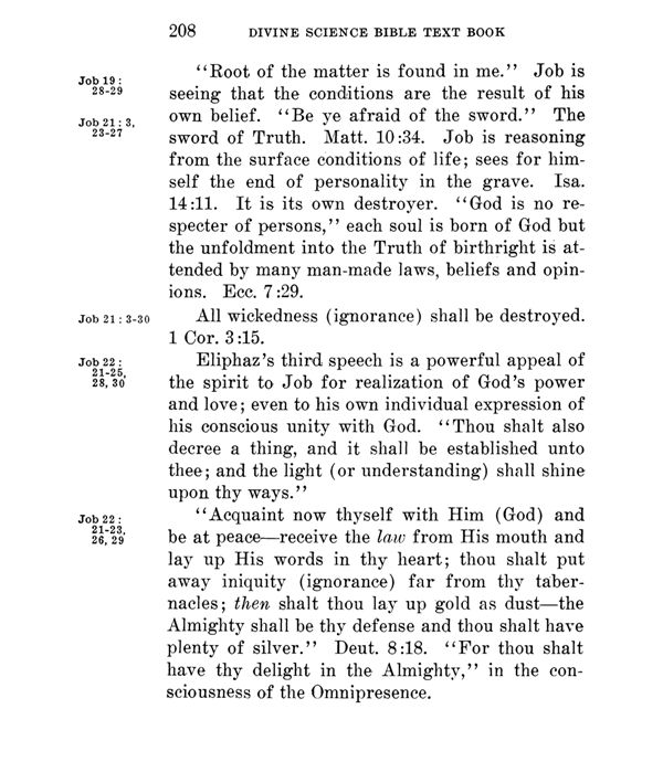 "Root of the matter is found in me." Job is seeing that the conditions are the result of his own belief. "Be ye afraid of the sword." The sword of Truth. Matt. 10:34. Job is reasoning from the surface conditions of life; sees for himself the end of personality in the grave. It is its own destroyer. "God is no respecter of persons," each soul is born of God but the unfoldment into the Truth of birthright is attended by many man-made laws, beliefs and opinions. Ecc. 7:29