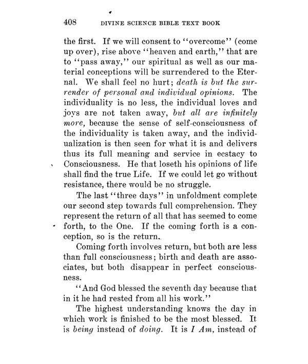 the first. If we will consent to " overcome" (come up over), rise above "heaven and earth," that' are to "pass away," our spiritual as well as our material conceptions will be surrendered to the Eternal. We shall feel no hurt death is but the surrender of personal and individual opinions. The individuality is no less, the individual loves and joys are not taken away, but all are infinitely more, because the sense of self-consciousness of the individuality is taken away, and the individualization is then seen for what it is and delivers thus its full meaning and service in ecstacy to Consciousness. He that loseth his opinions of life shall find the true Life. If we could let go without resistance, there would be no struggle.