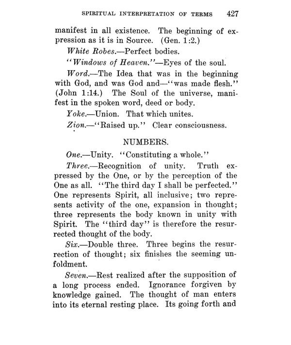 Three. --- Recognition of unity. Truth expressed by the One, or by the perception of the One as all. " The third day I shall be perfected." One represents Spirit, all inclusive; two represents activity of the one, expansion in thought; three represents the body known in unity with Spirit. The "third day" is therefore the resurrected thought of the body.