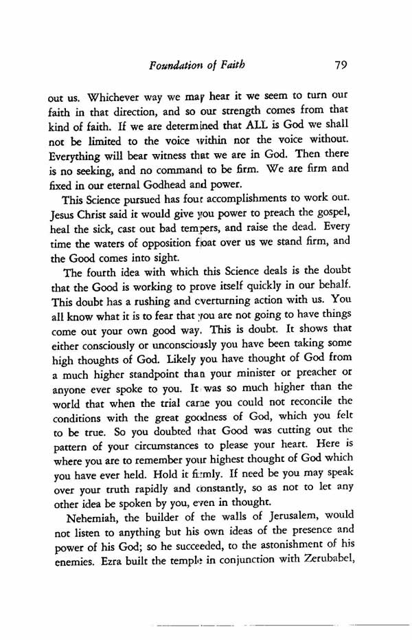 us. Whichever way we may hear it we seem to turn our faith in that direction, and so our strength comes from that kind of faith. If we are determined that ALL is God we shall not be limited to the voice within nor the voice without. Everything will bear witness that we are in God. Then there is no seeking, and no command to be firm. We are firm and fixed in our eternal Godhead and power.