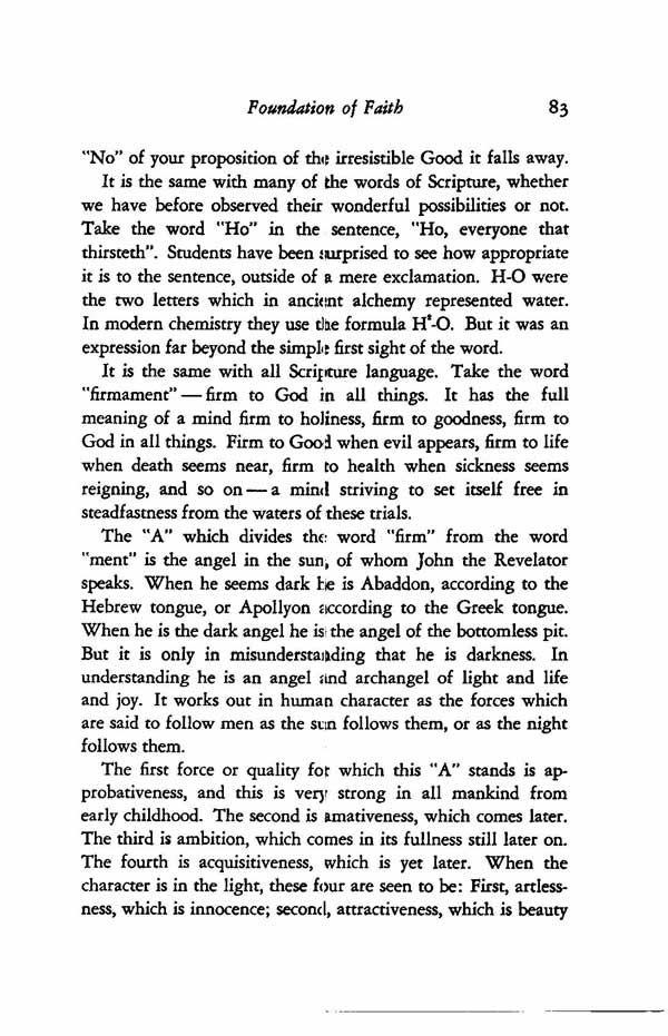 It is the same with all Scripture language. Take the word "firmament" firm to God in all things. It has the full meaning of a mind firm to holiness, firm to goodness, firm to God in all things. Firm to Good when evil appears, firm to life when death seems near, firm to health when sickness seems reigning, and so on a mind striving to set itself free in steadfastness from the waters of these trials.