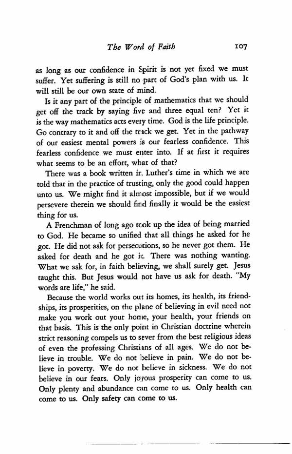 Because the world works out its homes, its health, its friendships, its prosperities, on the plane of believing in evil need not make you work out your home, your health, your friends on that basis. This is the only point in Christian doctrine wherein strict reasoning compels us to sever from the best religious ideas of even the professing Christians of all ages. We do not believe in trouble. We do not believe in pain. We do not believe in poverty. We do not believe in sickness. We do not believe in our fears. Only joyous prosperity can come to us. Only plenty and abundance can come to us. Only health can come to us. Only safety can come to us.