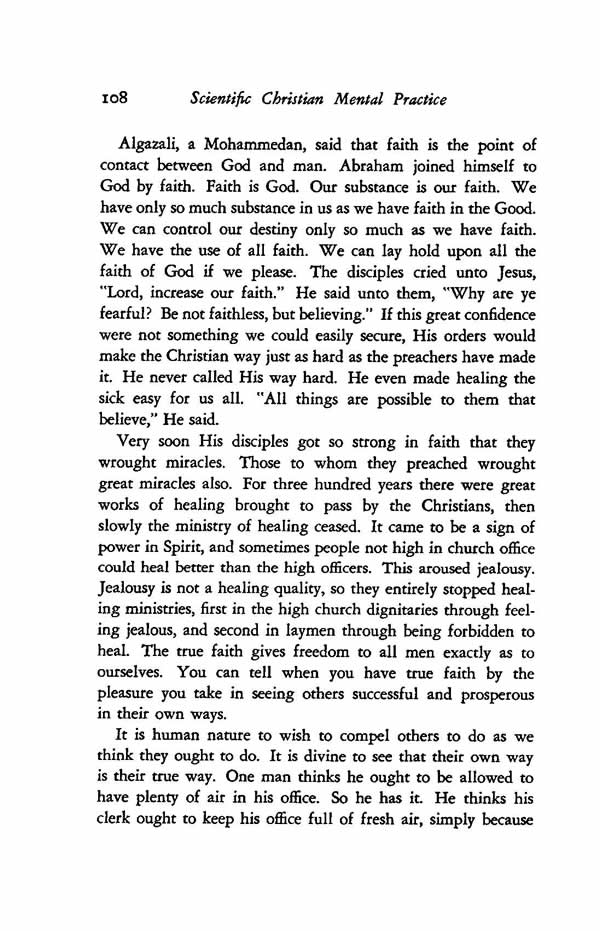 Algazali, a Mohammedan, said that faith is the point of contact between God and man. Abraham joined himself to God by faith. Faith is God. Our substance is our faith. We have only so much substance in us as we have faith in the Good. We can control our destiny only so much as we have faith. We have the use of all faith. We can lay hold upon all the faith of God if we please. The disciples cried unto Jesus, "Lord, increase our faith." He said unto them, "Why are ye fearful? Be not faithless, but believing." If this great confidence were not something we could easily secure, His orders would make the Christian way just as hard as the preachers have made it. He never called His way hard. He even made healing the sick easy for us all. "All things are possible to them that believe," He said.
