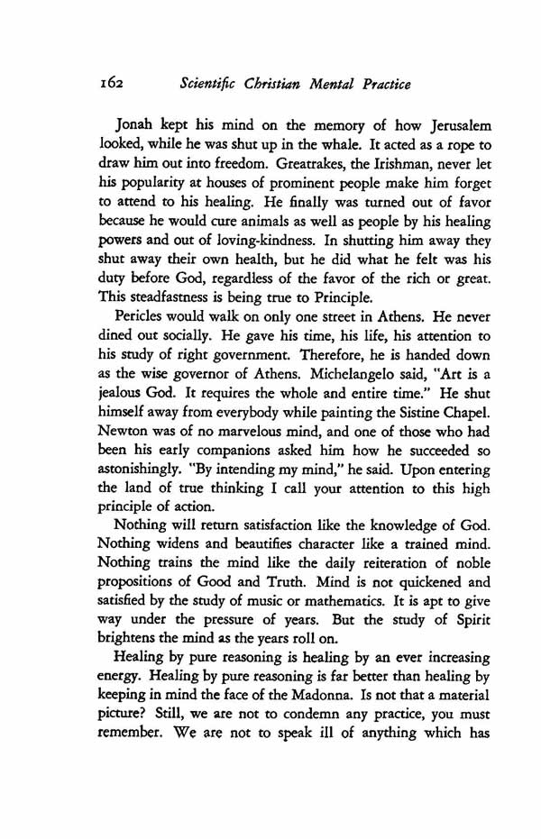 Jonah kept his mind on the memory of how Jerusalem looked, while he was shut up in the whale. It acted as a rope to draw him out into freedom. Greatrakes, the Irishman, never let his popularity at houses of prominent people make him forget to attend to his healing. He finally was turned out of favor because he would cure animals as well as people by his healing powers and out of loving-kindness. In shutting him away they shut away their own health, but he did what he felt was his duty before God, regardless of the favor of the rich or great. This steadfastness is being true to Principle.