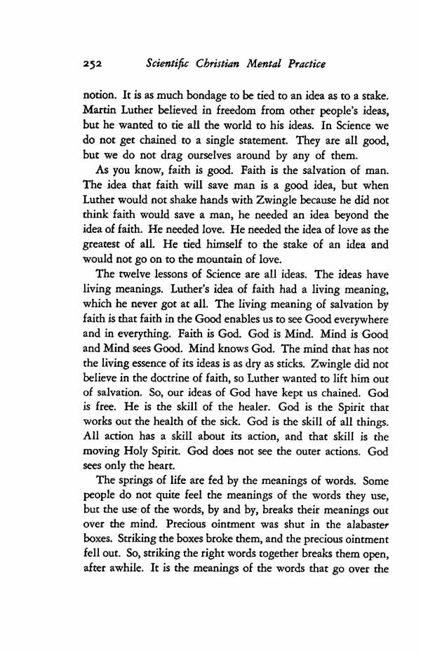 The twelve lessons of Science are all ideas. The ideas have living meanings. Luther's idea of faith had a living meaning, which he never got at all. The living meaning of salvation by faith is that faith in the Good enables us to see Good everywhere and in everything. Faith is God. God is Mind. Mind is Good and Mind sees Good. Mind knows God. The mind that has not the living essence of its ideas is as dry as sticks. Zwingle did not believe in the doctrine of faith, so Luther wanted to lift him out of salvation. So, our ideas of God have kept us chained. God is free. He is the skill of the healer. God is the Spirit that works out the health of the sick. God is the skill of all things. All action has a skill about its action, and that skill is the moving Holy Spirit. God does not see the outer actions. God sees only the heart.
