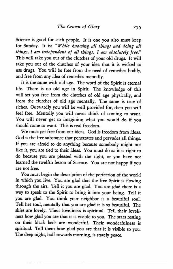 You must begin the description of the perfection of the world in which you live. You are glad that the free Spirit is flowing through the airs. Tell it you are glad. You are glad there is a way to speak to the Spirit to bring it into your being. Tell it you are glad. You think your neighbor is a beautiful soul. Tell her soul, mentally that you are glad it is so beautiful. The skies are lovely. Their loveliness is spiritual. Tell their loveliness how glad you are that it is visible to you. The stars resting on their black beds are wonderful. Their wonderfulness is spiritual. Tell them how glad you are that it is visible to you. The deep night, half towards morning, is stately peace.