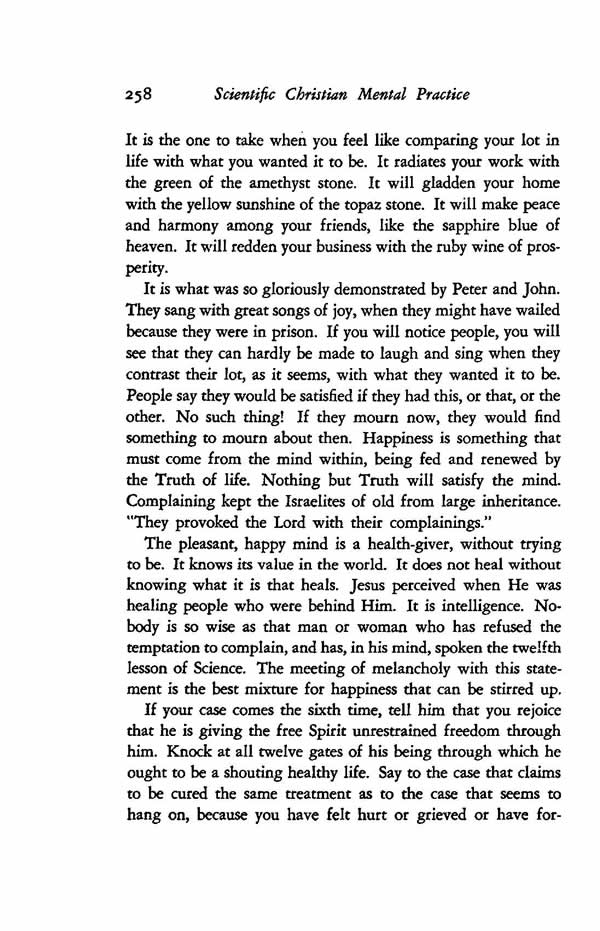 It is what was so gloriously demonstrated by Peter and John. They sang with great songs of joy, when they might have wailed because they were in prison. If you will notice people, you will see that they can hardly be made to laugh and sing when they contrast their lot, as it seems, with what they wanted it to be. People say they would be satisfied if they had this, or that, or the other. No such thing! If they mourn now, they would find something to mourn about then. Happiness is something that must come from the mind within, being fed and renewed by the Truth of life. Nothing but Truth will satisfy the mind. Complaining kept the Israelites of old from large inheritance. "They provoked the Lord with their complainings."
