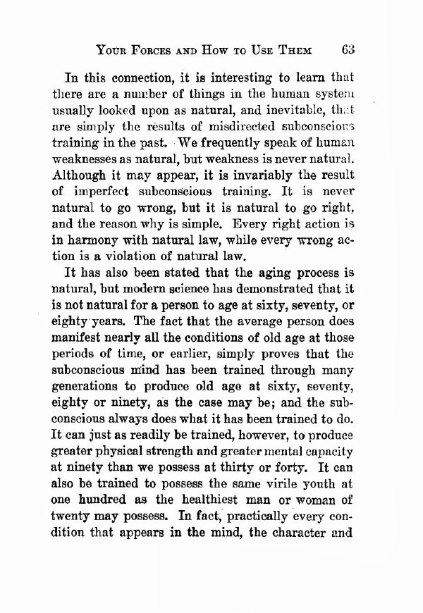 It has also been stated that the aging process is natural, but modern science has demonstrated that it is not natural for a person to age at sixty, seventy, or eighty years. The fact that the average person does manifest nearly all the conditions of old age at those periods of time, or earlier, simply proves that the subconscious mind has been trained through many generations to produce old age at sixty, seventy, eighty or ninety, as the case may be, and the subconscious always does what it has been trained to do. It can just as readily be trained, however, to produce greater physical strength and greater mental capacity at ninety than we possess at thirty or forty. It can also be trained to possess the same virile youth at one hundred as the healthiest man or woman of twenty may possess. In fact, practically every condition that appears in the mind, the character