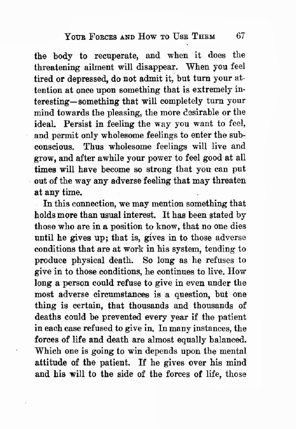 In this connection, we may mention something that holds more than usual interest. It has been stated by those who are in a position to know, that no one dies until they give up; that is, gives in to those adverse conditions that are at work in their system, tending to produce physical death. So long as he or she refuses to give in to those conditions, they continue to live. How long a person could refuse to give in even under the most adverse circumstances is a question, but one thing is certain, that thousands and thousands of deaths could be prevented every year if the patient in each case refused to give in. In many instances, the forces of life and death are almost equally balanced. Which one is going to win depends upon the mental attitude of the patient. If he or she gives over the mind and will to the side of the forces of life, those