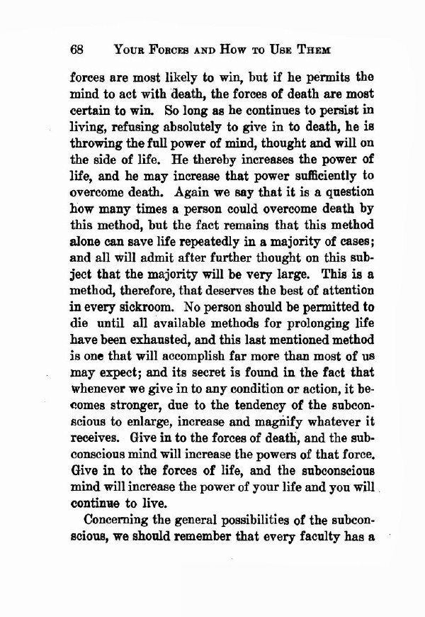 So long as one continues to persist in living, refusing absolutely to give into death, they are throwing the full power of mind, thought and will on the side of life. They thereby increase the power of life, and may increase that power sufficiently to overcome death. Again we say that it is a question how many times a person could overcome death by this method, but the fact remains that this method alone can save life repeatedly in the majority of cases; and all will admit after further thought on this subject that the majority will be very large. This is a method, therefore, that deserves the best of attention in every sickroom. No person should be permitted to die until all available methods for prolonging life have been exhausted, and this last mentioned method is one that will accomplish far more than most of us may expect; and its secret is found in the fact that whenever we give in to any condition or action, it becomes stronger, due to the tendency of the subconscious to enlarge, increase and magnify whatever it receives. Give in to the forces of death, and the subconscious mind will increase the powers of that force. Give in to the forces of life, and the subconscious mind will increase the power of your life and you will continue to live.