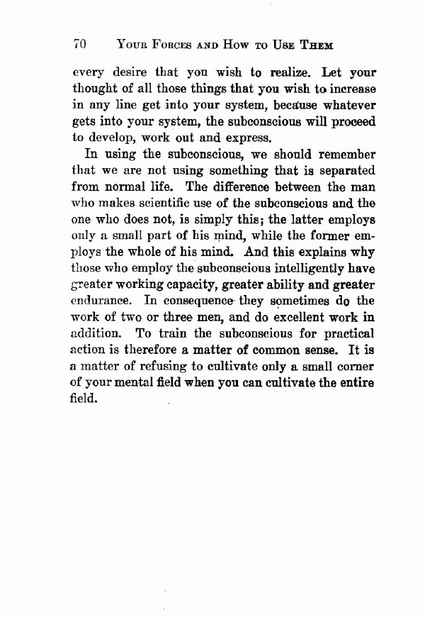 In using the subconscious, we should remember that we are not using something that is separated from normal life. The difference between the individual who makes scientific use of the subconscious and the one who does not, is simply this; the latter employs only a small part of their mind, while the former employs the whole of their mind. And this explains why those who employ the subconscious intelligently have greater working capacity, greater ability and greater endurance. In consequence they sometimes do the work of two or three people, and do excellent work in addition. To train the subconscious for practical action is therefore a matter of common sense. It is a matter of refusing to cultivate only a small corner of your mental field when you can cultivate the entire field.
