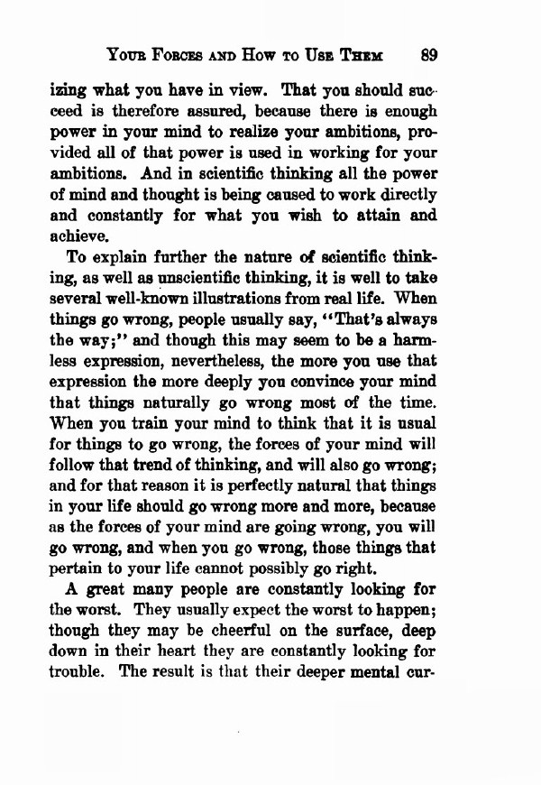 To explain further the nature of scientific thinking, as well as unscientific thinking, it is well to take several well-known illustrations from real life. When things go wrong, people usually say, "That's always the way"; and though this may seem to be a harmless expression, nevertheless, the more you use that expression the more deeply you convince your mind that things naturally go wrong most of the time. When you train your mind to think that it is usual for things to go wrong, the forces of your mind will follow that trend of thinking, and will also go wrong; and for that reason it is perfectly natural that things in your life should go wrong more and more, because as the forces of your mind are going wrong, you will go wrong, and when you go wrong, those things that pertain to your life cannot possibly go right.