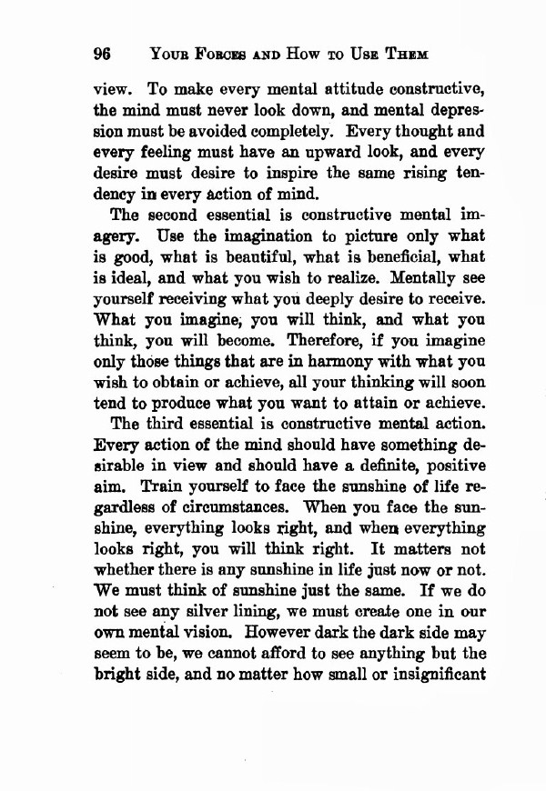 The third essential is constructive mental action. Every action of the mind should have something desirable in view and should have a definite, positive aim. Train yourself to face the sunshine of life regardless of circumstances. When you face the sunshine, everything looks right, and when everything looks right, you will think right. It matters not whether there is any sunshine in life just now or not. We must think of sunshine just the same. If we do not see any silver lining, we must create one in our own mental vision. However dark the dark side may seem to be, we cannot afford to see anything but the bright side, and no matter how small or insignificant