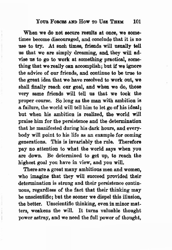 When we do not secure results at once, we sometimes become discouraged, and conclude that it is no use to try. At such times, friends will usually tell us that we are simply dreaming, and they will advise us to go to work at something practical, something that we really can accomplish; but if we ignore the advice of our friends, and continue to be true to the great idea that we have resolved to work out, we shall finally reach our goal, and when we do, those very same friends will tell us that we took the proper course. So long as the man with ambition is a failure, the world will tell him to let go of his ideal; but when his ambition is realized, the world will praise him for the persistence and the determination that he manifested during his dark hours, and everybody will point to his life as an example for coming generations. This is invariably the rule. Therefore pay no attention to what the world says when you are down. Be determined to get up, to reach the highest goal you have in view, and you will.