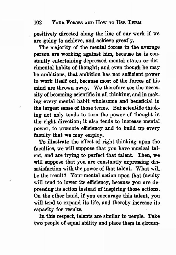 To illustrate the effect of right thinking upon the faculties, we will suppose that you have musical talent, and are trying to perfect that talent. Then, we will suppose that you are constantly expressing dissatisfaction with the power of that talent. What will be the result? Your mental action upon that faculty will tend to lower its efficiency, because you are depressing its action instead of inspiring those actions. On the other hand, if you encourage this talent, you will tend to expand its life, and thereby increase its capacity for results.