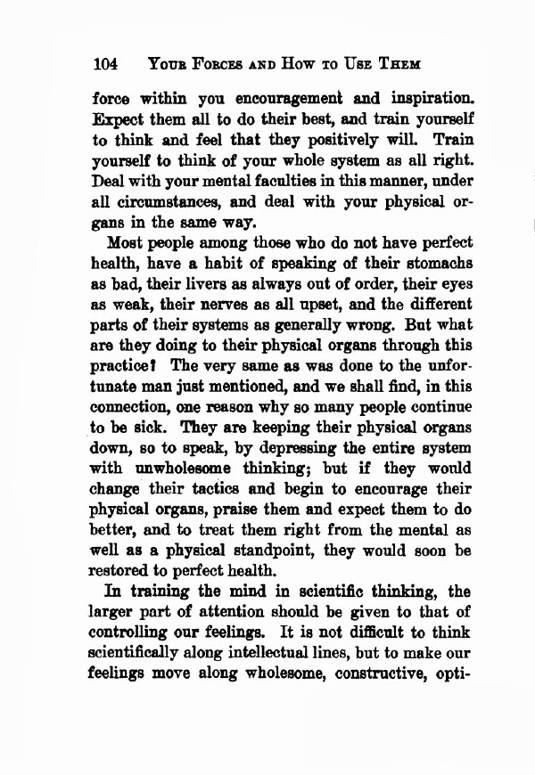 Most people among those who do not have perfect health, have a habit of speaking of their stomachs as bad, their livers as always out of order, their eyes as weak, their nerves as all upset, and the different parts of their systems as generally wrong. But what are they doing to their physical organs through this practice? The very same as was done to the unfortunate man just mentioned, and we shall find, in this connection, one reason why so many people continue to be sick. They are keeping their physical organs down, so to speak, by depressing the entire system with unwholesome thinking; but if they would change their tactics and begin to encourage their physical organs, praise them and expect them to do better, and to treat them right from the mental as well as a physical standpoint, they would soon be restored to perfect health.
