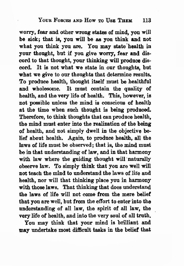 It is not what we state in our thoughts, but what we give to our thoughts that determine results. To produce health, thought itself must be healthful and wholesome. It must contain the quality of health, and the very life of health. This, however, is not possible unless the mind is conscious of health at the time when such thought is being produced. Therefore, to think thoughts that can produce health, the mind must enter into the realization of the being of health, and not simply dwell in the objective belief about health. Again, to produce health, all the laws of life must be observed; that is, the mind must be in that understanding of law, and in that harmony with law where the guiding thought will naturally observe law. To simply think that you are well will not teach the mind to understand the laws of life and health, nor will that thinking place you in harmony with those laws. That thinking that does understand the laws of life will not come from the mere belief that you are well, but from the effort to enter into the understanding of all law, the spirit of all law, the very life of health, and into the very soul of all truth.