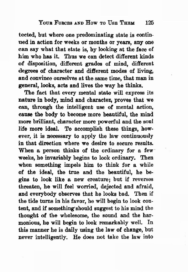 The fact that every mental state will express its nature in body, mind and character proves that we can, through the intelligent use of mental action, cleanse the body to become more beautiful, the mind more brilliant, character more powerful and the soul life more ideal. To accomplish these things, how ever, it is necessary to apply the law continuously in that direction where we desire to secure results. When a person thinks of the ordinary for a few weeks, he invariably begins to look ordinary. Then when something impels him to think for a while of the ideal, the true and the beautiful, he begins to look like a new creature; but if reverses threaten, he will feel worried, dejected and afraid, and everybody observes that he looks bad. Then if the tide turns in his favor, he will begin to look content, and if something should suggest to his mind the thought of the wholesome, the sound and the harmonious, he will begin to look remarkably well. In this manner he is daily using the law of change, but never intelligently. He does not take the law into
