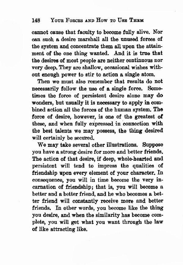 We may take several other illustrations. Suppose you have a strong desire for more and better friends. The action of that desire, if deep, whole-hearted and persistent will tend to impress the qualities of friendship upon every element of your character. In consequence, you will in time become the very incarnation of friendship; that is, you will become a better and a better friend, and he who becomes a better friend will constantly receive more and better friends. In other words, you become like the thing you desire, and when the similarity has become complete you will get what you want through the law of like attracting like.