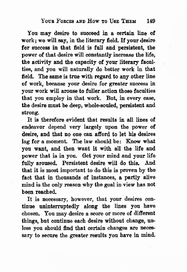 You may desire to succeed in a certain line of work; we will say, in the literary field. If your desire for success in that field is full and persistent, the power of that desire will constantly increase the life, the activity and the capacity of your literary faculties, and you will naturally do better work in that field. The same is true with regard to any other line of work, because your desire for greater success in your work will arouse to fuller action those faculties that you employ in that work. But, in every case, the desire must be deep, whole-souled, persistent and strong.