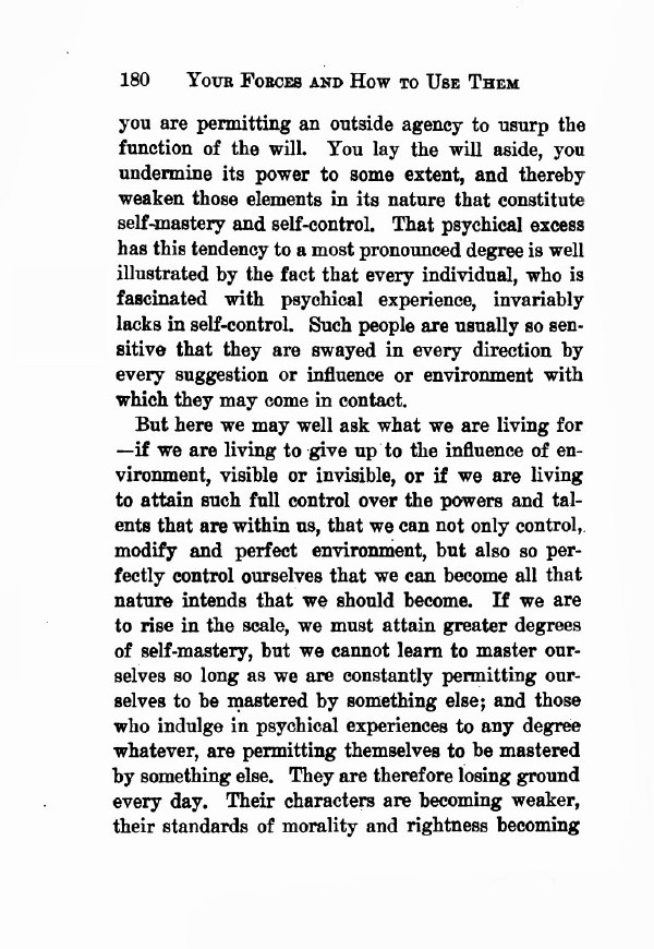 But here we may well ask what we are living for -- if we are living to give up to the influence of environment, visible or invisible, or if we are living to attain such full control over the powers and talents that are within us, that we can not only control, modify, and perfect environment, but also so perfectly control ourselves that we can become all that nature intends that we should become. If we are to rise in the scale, we must attain greater degrees of self-mastery, but we cannot learn to master ourselves so long as we are constantly permitting ourselves to be mastered by something else; and those who indulge in psychical experiences to any degree whatever, are permitting themselves to be mastered by something else. They are therefore losing ground every day. Their characters are becoming weaker, their standards of morality and rightness becoming