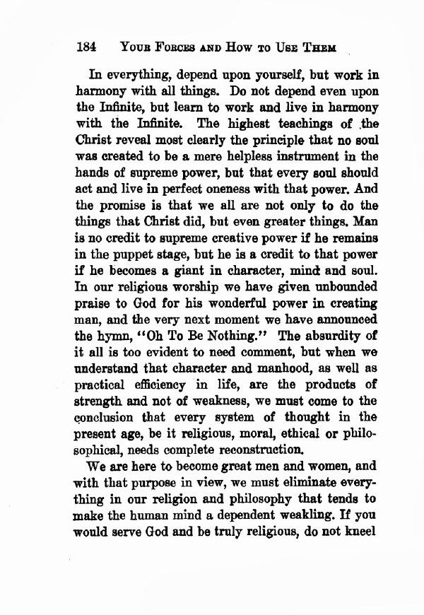 In everything, depend upon yourself, but work in harmony with all things. Do not depend even upon the Infinite, but learn to work and live in harmony with the Infinite. The highest teachings of the Christ reveal most clearly the principle that no soul was created to be a mere helpless instrument in the hands of Supreme Power, but that every soul should act and live in perfect oneness with that Power. And the promise is that we all are not only to do the things that Christ did, but even greater things. Man is no credit to Supreme Creative Power if he remains in the puppet stage, but he is a credit to that Power if he becomes a giant in character, mind and soul. In our religious worship we have given unbounded praise to God for His wonderful power in creating man, and the very next moment we have announced the hymn, "Oh To Be Nothing." The absurdity of it all is too evident to need comment, but when we understand that character and manhood, as well as practical efficiency in life, are the products of strength and not of weakness, we must come to the conclusion that every system of thought in the present age, be it religious, moral, ethical, or philosophical, needs complete reconstruction.